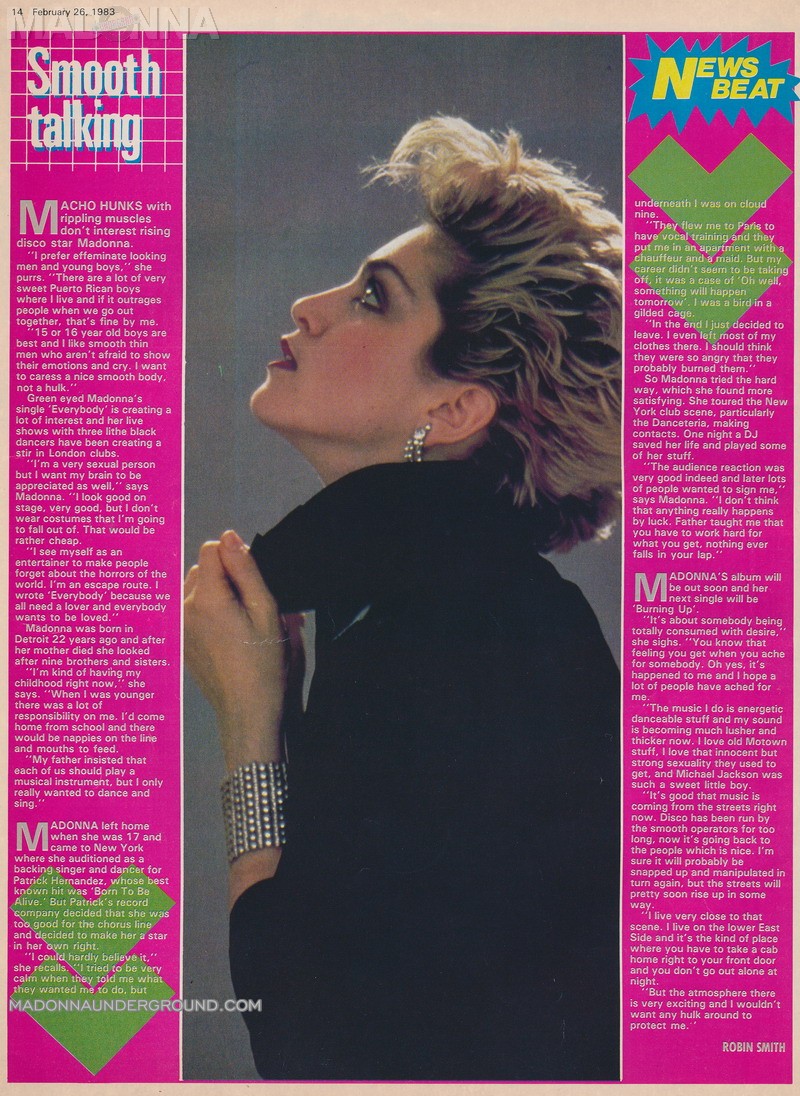 Take a look at this very early interview originally published in Record Mirror dated February 26, 1983. Madonna was on to promote her debut single ‘Everybody’ and spoke about macho hunks, being a very sexual person, going to Paris and upcoming single ‘Burning Up.’ This article has been added to the press section of The First Album page.