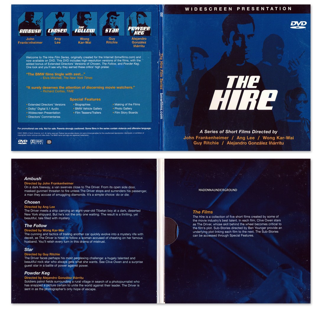 The BMW film series The Hire is a series of eight short films (averaging about ten minutes each) produced for the Internet in 2001 and 2002. A form of branded content, the shorts were directed by popular filmmakers from around the globe and starred Clive Owen as “the Driver” while highlighting the performance aspects of various BMW automobiles.