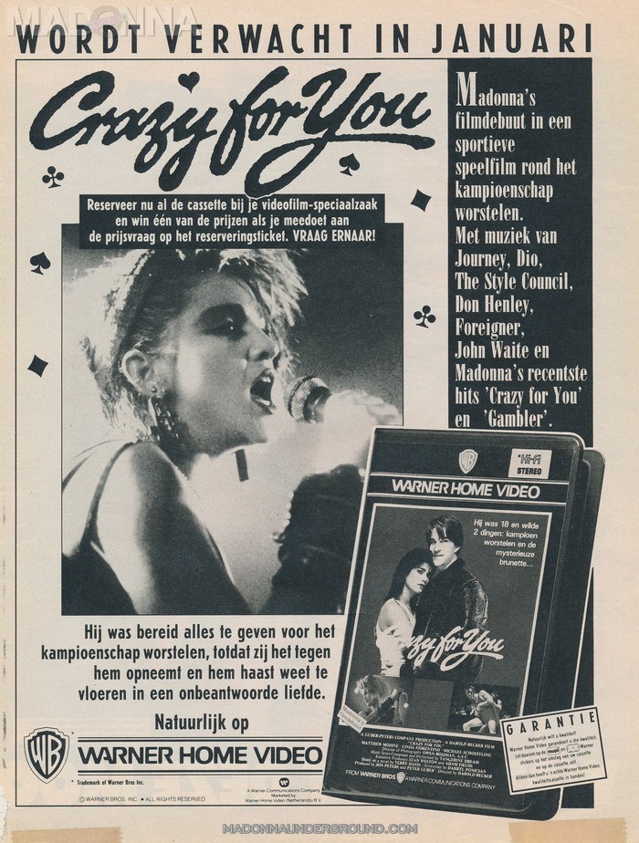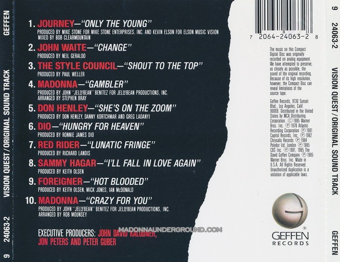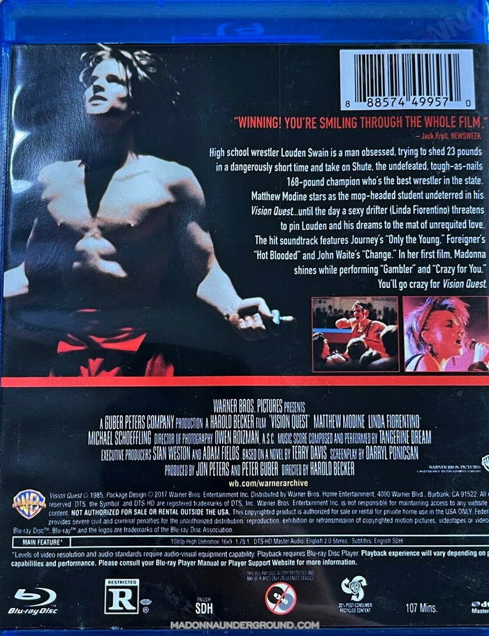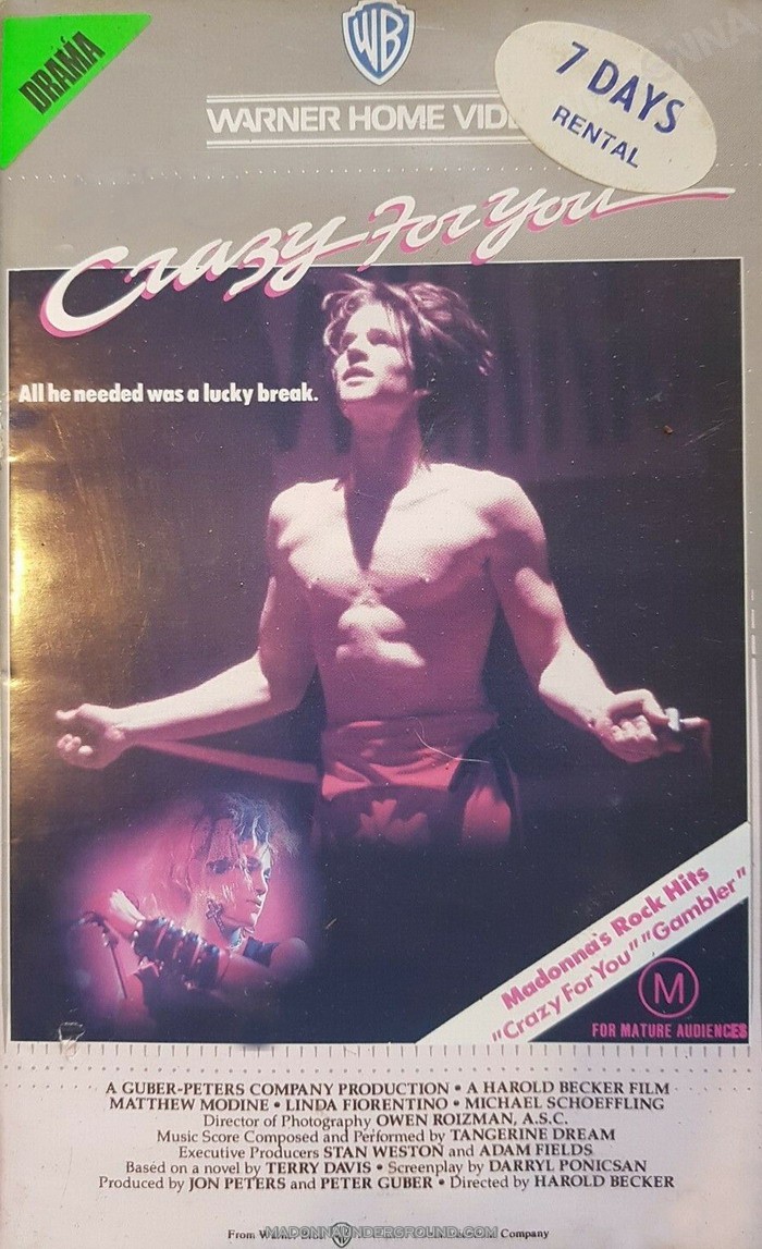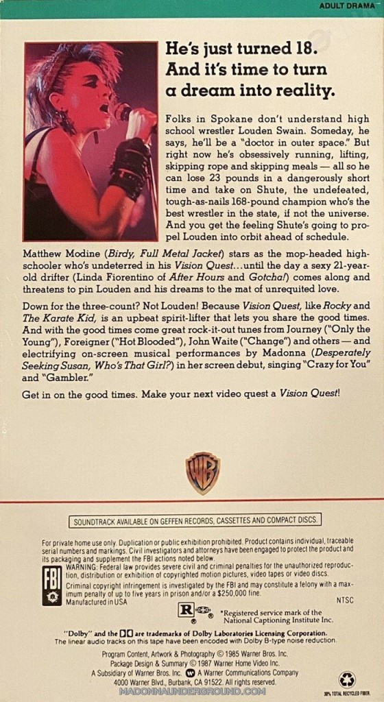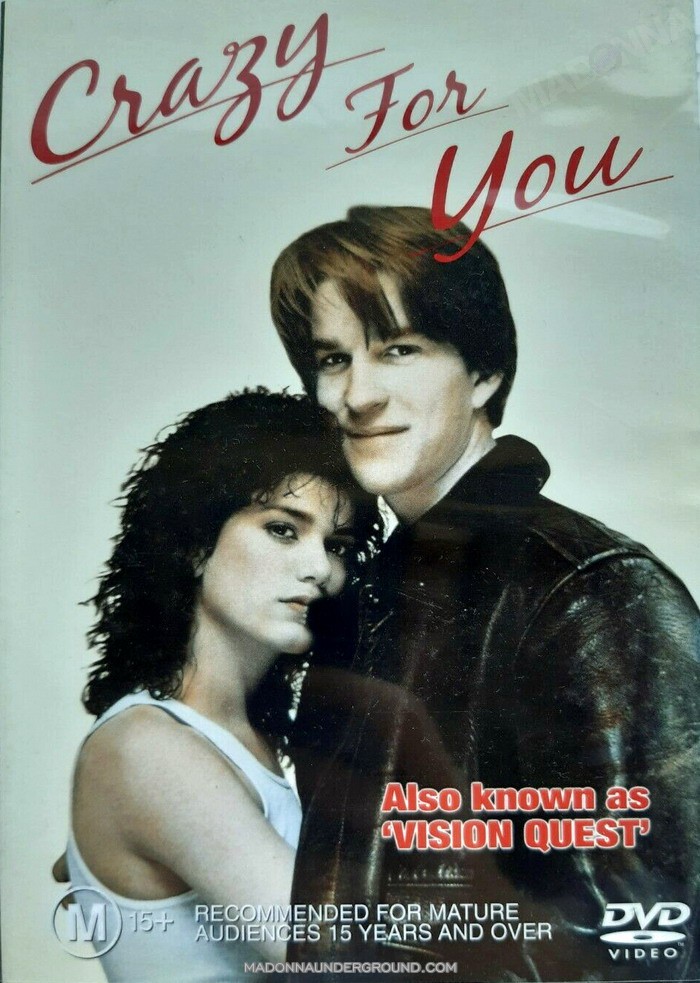 Vision Quest is Madonna’s first movie (not counting A Certain Sacrifice), doing a night club singer. She performs Gambler and Crazy For You (Madonna had huge hits with both singles, and the film company decided to rename the movie Crazy for You in Europe and Australia.