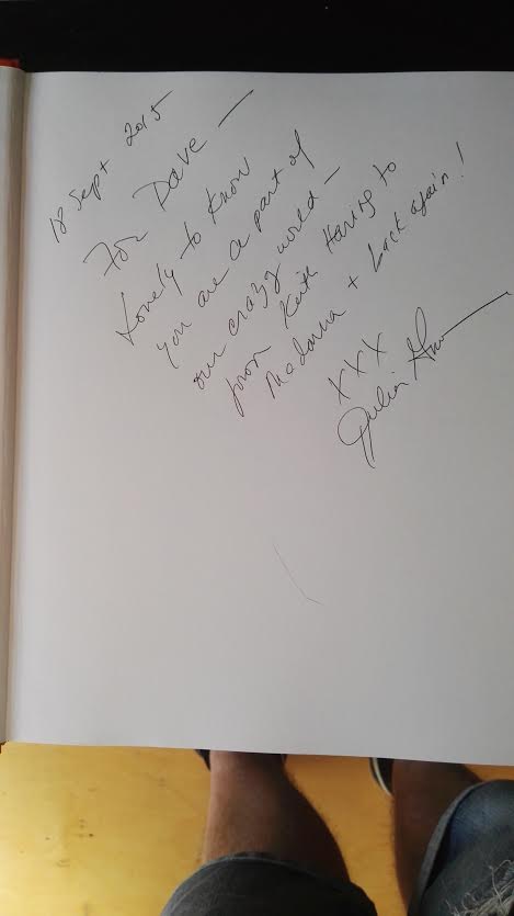I quickly bought some merchandise; the catalogue and some small official merchandise gadgets. During our lunch I asked Julie to sign the exhibition catalogue, an idea by Henk-Jan. Love what she wrote “Lovely to know, your a part of our crazy world. From Keith Haring to Madonna + back again!