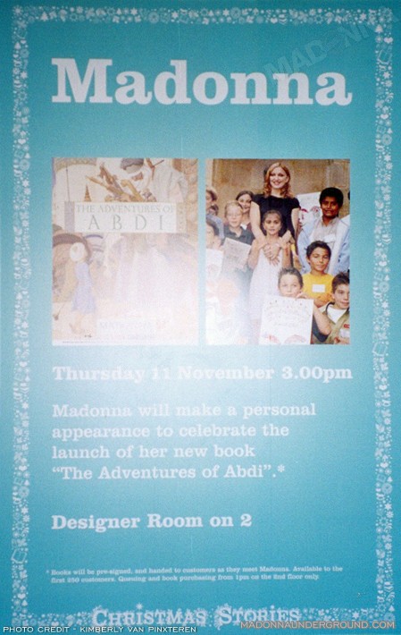 G7FJ31 Pop star Madonna during a special appearance at Selfridges in Oxford Street, central London to sign copies of her fourth children's book, The Adventures of Abdi.