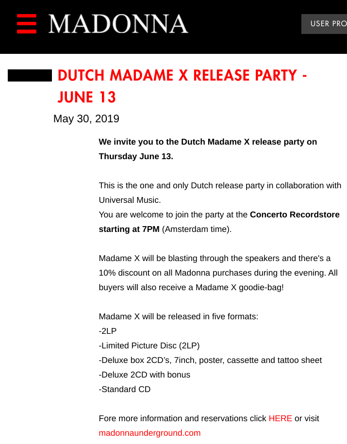The Madame X Dutch release party at Concerto is now live in ‘Fan Events’ on Madonna’s official website (madonna.com)