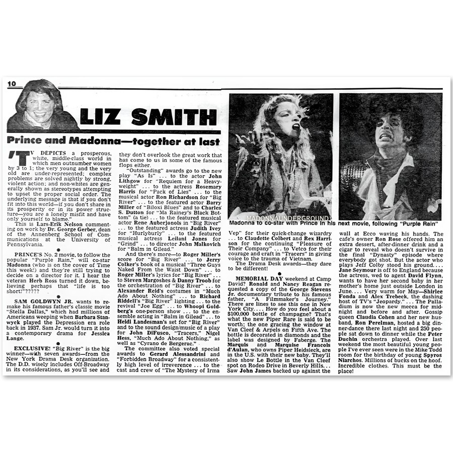 In May 1985, Liz Smith reported that Madonna was expected to co-star with Prince in his next film following Purple Rain.