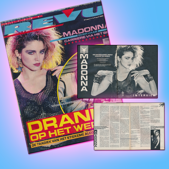 The very first time Madonna covered the Dutch Nieuwe Revu magazine was on the March 27 – April 4 1985 edition. While the four page spread inside was a Dutch translation of the interview originally from Face magazine, the pictures were by Dutch photographer Kees Tabak.