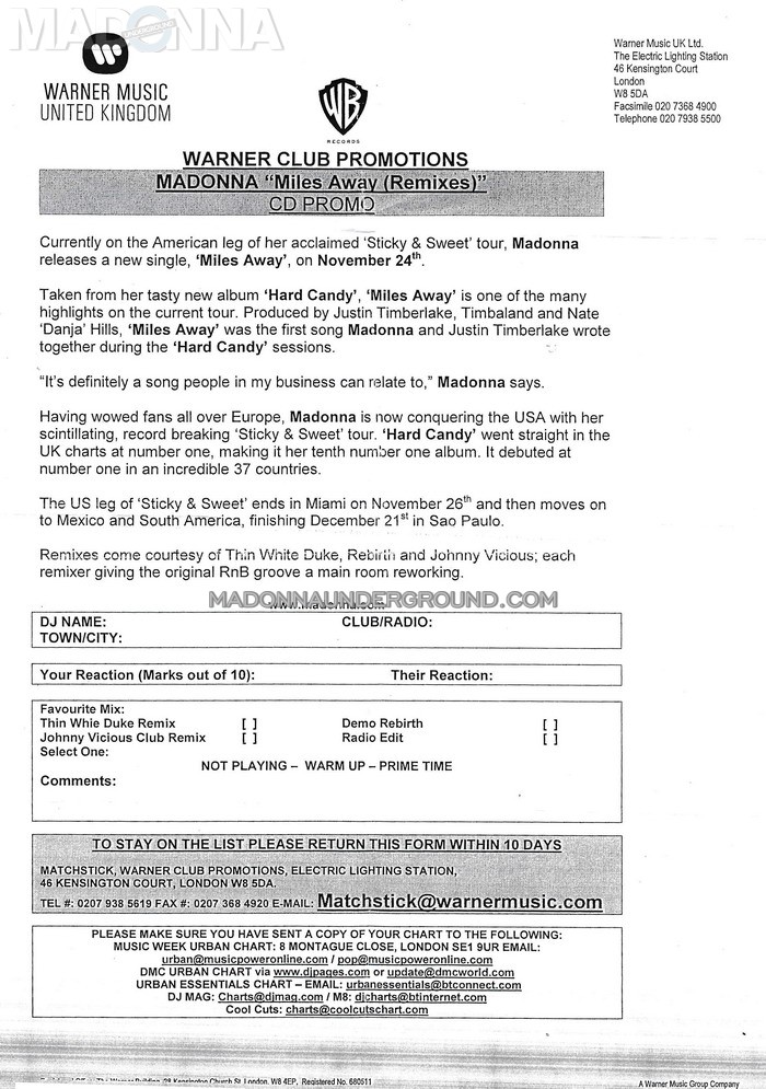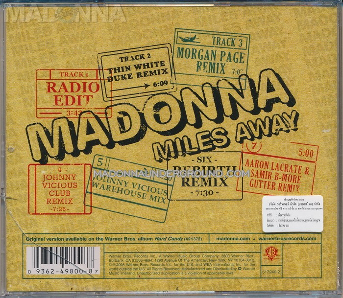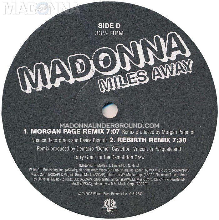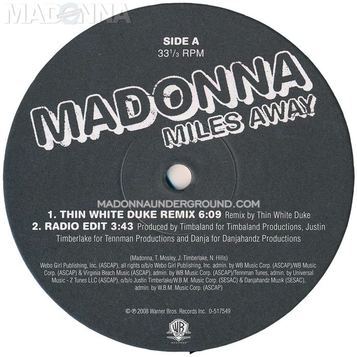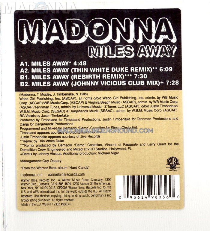 Beide singles bevatten de album versie van ‘Miles Away’ en de ‘Thin White Duke Remix’. Deze remix is gemaakt door de succesvolle producer Stuart Price waarmee Madonna ook haar vorige album ‘Confessions On A Dancefloor’ heeft gemaakt. De maxi single bevat bovendien 2 extra remixen.