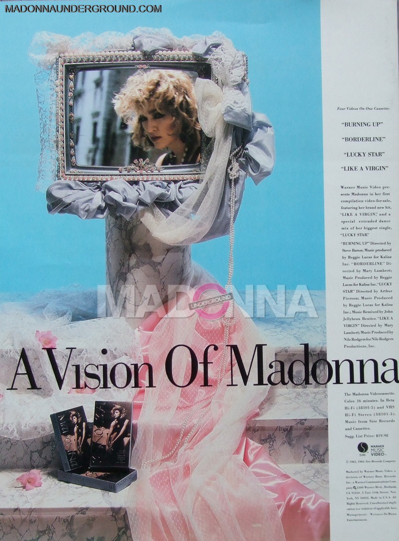 ‘Warner Music Video presents Madonna in her first compilation video-for-sale, featuring her brand new hit. “LIKE A VIRGIN’, and a special mix of her biggest single, “LUCKY STAR.” “BURNING UP” Directed by Steve Baron; Music produced by Reggie Lucas for Kalisa Inc. “LUCKY STAR” Directed by Arthur Pierson; Music produced by Reggie Lucas for Kalisa INc.; Music Remixed by John Jellybean Benitez. “LIKE A VIRGIN’ Directed by Mary Lambert;Music produced by Nile Rodgers for Nile Rodgers Productions, Inc.’