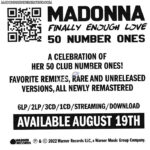 To celebrate this historic milestone, Madonna curated two new collections: FINALLY ENOUGH LOVE: 50 NUMBER ONES, a new 50-track collection that includes her favorite remixes of those chart-topping dance hits that have filled clubs worldwide for four decades, and an abridged 16-track version, simply titled FINALLY ENOUGH LOVE.