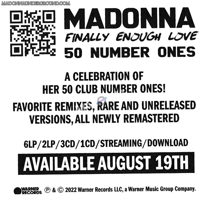 Met meer dan 220 minuten aan remixes neemt FINALLY ENOUGH LOVE: 50 NUMBER ONES je mee in de muzikale reis die Madonna heeft afgelegd en die haar tot een internationaal icoon heeft gemaakt. De collectie bestaat uit Madonna’s 50 favorieten, waaronder een aantal remix-opnames die voor het eerst officieel worden uitgebracht of hun digitale debuut maken. FINALLY ENOUGH LOVE: 50 NUMBER ONES zal op 19 augustus digitaal beschikbaar zijn samen met de 3CD versie. Een limited edition 6LP zal exclusief verkrijgbaar zijn via Madonna’s website en Rhino.com.