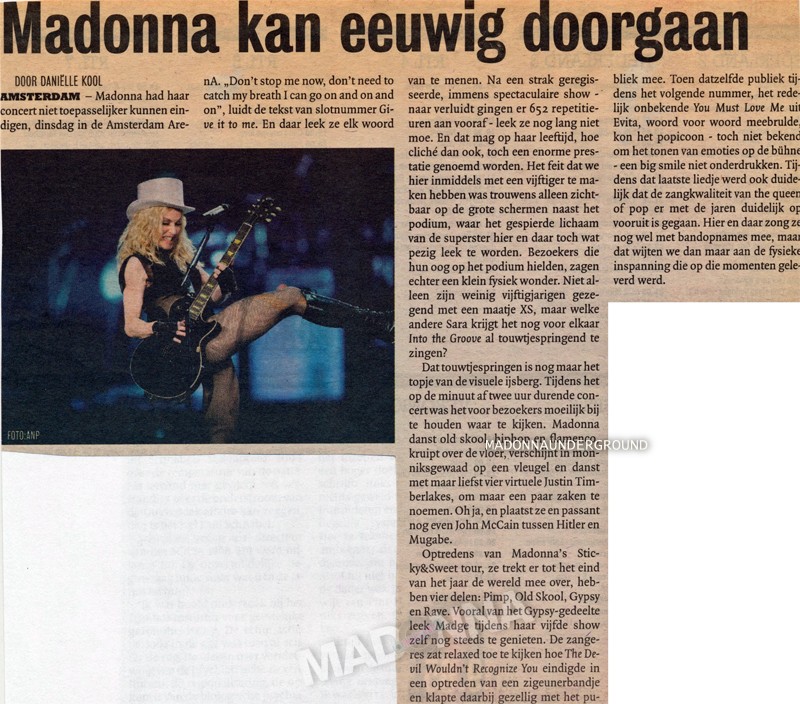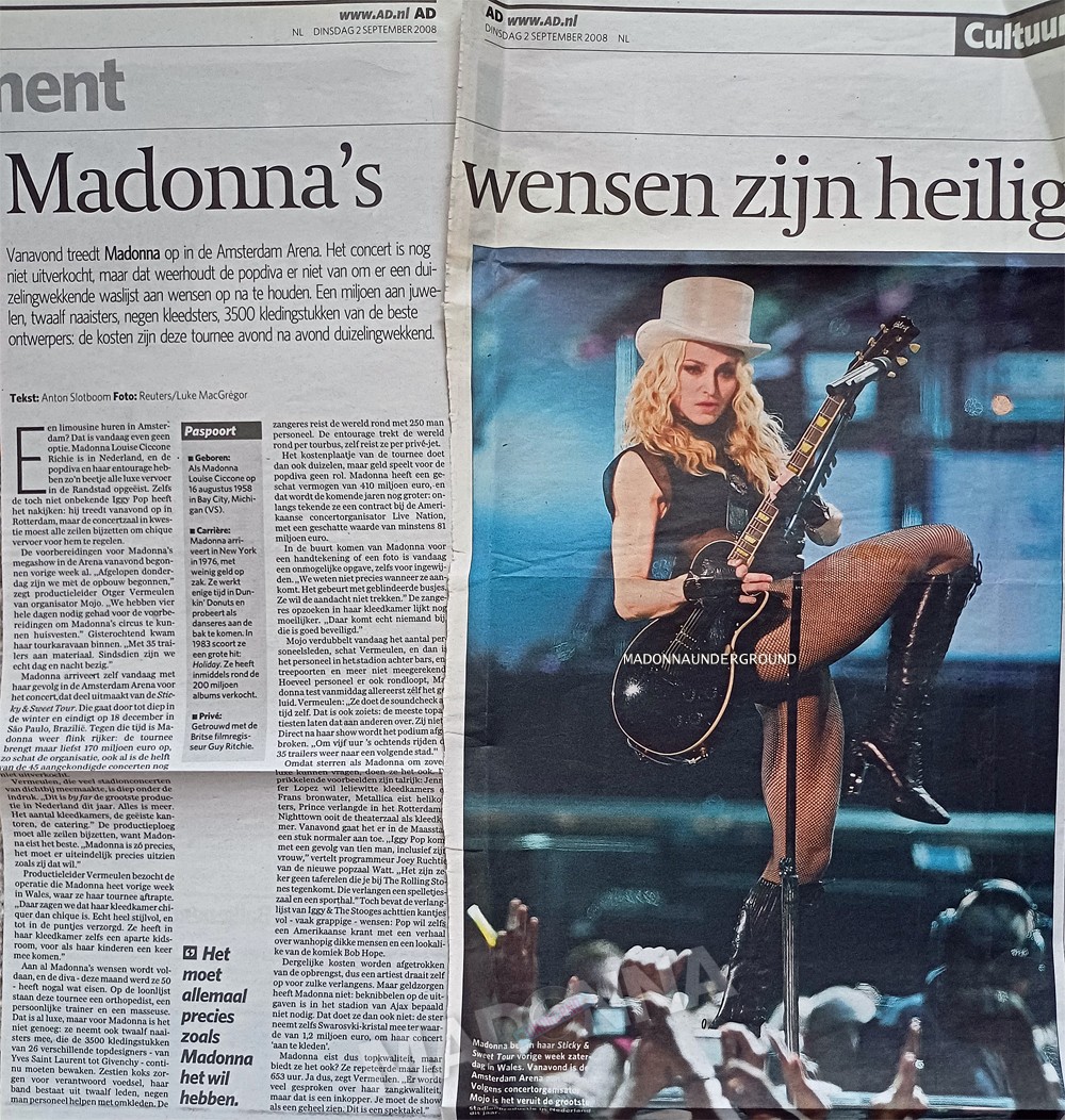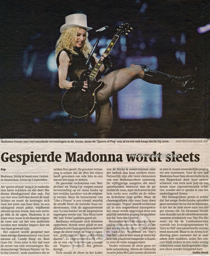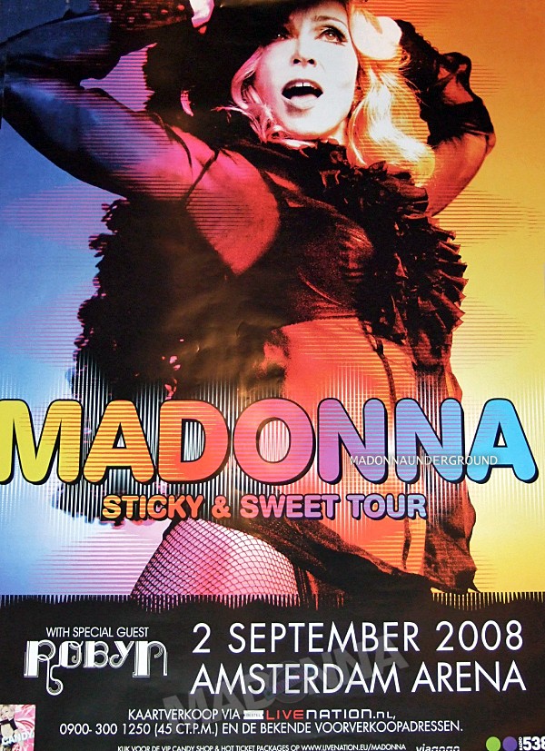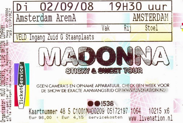 Vandaag is bekend gemaakt dat superster Madonna op dinsdag 2 september een eenmalig concert geeft in de Amsterdam ArenA. Het concert is onderdeel van de Sticky & Sweet Tour die op 23 augustus start in Cardiff, Wales, en naast Amsterdam onder meer ook Londen en Parijs aandoet. De aankondiging van Madonna’s nieuwe wereldtournee volgt op het verschijnen van haar succesvolle nieuwe album Hard Candy, dat wereldwijd op 1 in de album charts binnen kwam. De kaartverkoop van het concert start op zaterdag 17 mei 2008 om 10.00 uur.