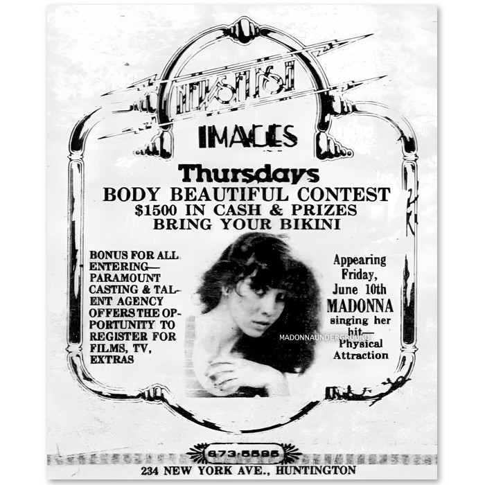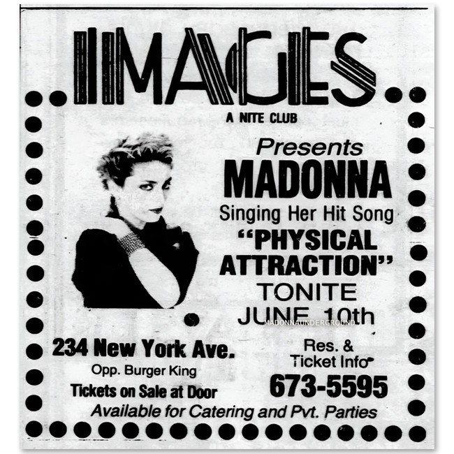 We have recently discovered two promotional adverts highlighting an early Madonna performance at IMAGES (A Nite Club), located at 234 New York Avenue. The adverts announce that Madonna would be performing her hit song “Physical Attraction” on June 10, 1983, with tickets available at the door.