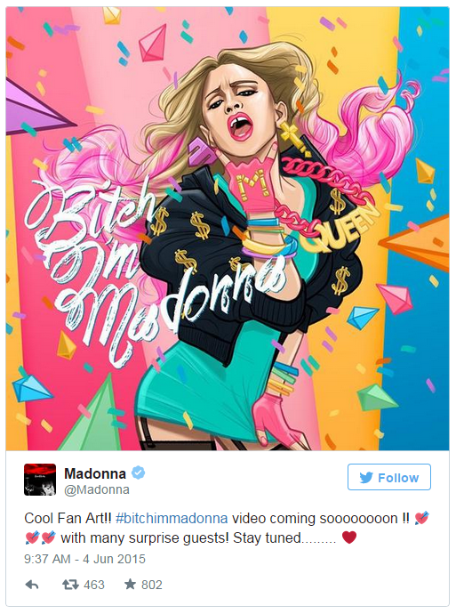 Madge headed to Twitter on Thursday (May 4) to tease the forthcoming visual, the latest from her Rebel Heart album release. “Cool Fan Art!! #bitchimmadonna video coming soooooooon !!” she wrote on Twitter, adding “With many surprise guests! Stay tuned………”
