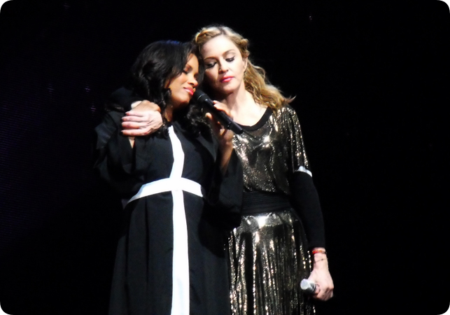 ‘BONG…..OMG’ the well known intro started, it was so good to be here and see it again! Crew member Jean Michel Ete entered the Triangle and was incredibly surprised to see me there. After a stern but warm welcome hug by him, I turned around to face The Queen again. The show was as expected, absolutely incredible. There were some changes to the show comparede to what we saw in Europe. First there was the addition of the Bible during Gang Bang. Right before I Don’t Give A, the dressed dancers from Papa Don’t Preach followed her onto the catwalk. Madonna’s speech was dedicated to the victims of hurricane Sandy and why tragedies always have to happen first to make us take care of one another. Like a Virgin was really extended compared to the performance in Europe. She stripped down to her body stocking; the purpose was ‘I am stripping for you, what do you do when a girl takes her clothes off, you give her money’. It was Madonna’s way of raising money for the victims of hurricane Sandy. On top of the piano she gave us a true Basic Instinct/Sharon Stone moment. The performance was so much better than in Europe, true perfection. Suddenly someone tapped me on my shoulder, when I turned around it was Debby! Debby is a crew member of M, we had met her previously in Paris (Stade de France) and then again at Olympia. She was so surprised to see me “I didn’t know you were coming!!” she gave me a big hug and we chatted for a while, I just love her!