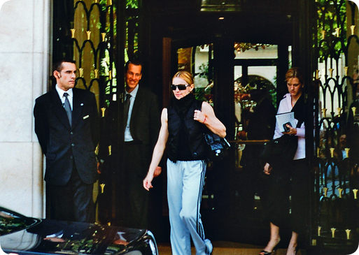 Today we decided to go and check out the hotel where Madonna was staying, George V (the hotel from the movie French Kiss). When we got there, some fans had already gathered at the barriers that were put up in front of the hotel. When it was about 3 in the afternoon, the other documentary crew arrived (the one with Jonas Akerlund). They went inside the hotel, came back out a while later and started to film the fans. When it was about 4, Madonna finally came out, I was literally shaking on my legs. Was the first time I saw her again without a show around her. She looked stunning, black sunglasses, hair pulled back, tracksuit and black bodywarmer. She smiled to us and I got the chance to take some nice pics and simon had filmed the moment.