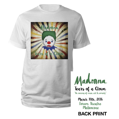 Exclusive artwork from the Madonna Forum Theatre Melbourne March 10th 2016 Event. Tears of a Clown “An evening of music, art & comedy” is printed on the back of this white 100% cotton tee (US$34.95)